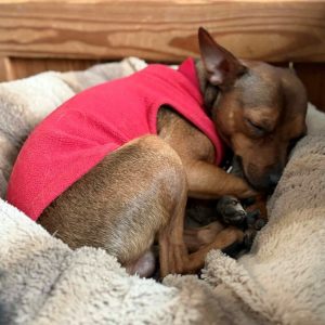 When he’s not snuggled up as close as he can physically get to his person, Churro will happily settle in his bed. He’s an easy keeper who enjoys walks (as long as he can wear his sweater), doesn’t mind car rides, and gets along with other dogs. He’s doing very well on housebreaking and making progress with cratetraining, but can also be left loose in the home successfully. Churro will do best in a quiet home where someone is home more often than not. No small children please — he wants to be the baby of the family!