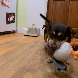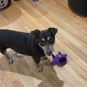 Dunkin Donut is the perfect combination of playful and cuddly. He is a young guy who traveled from the south to find his family. He likes to play with toys especially if they squeak. He is housebroken and crate trained. He enjoys walks and walks well on leash. And as a medium energy dog, he doesn’t require long walks. After a short walk or long play session, he settles into the couch to watch TV. He is also good in the car, after a short bout of nervousness.