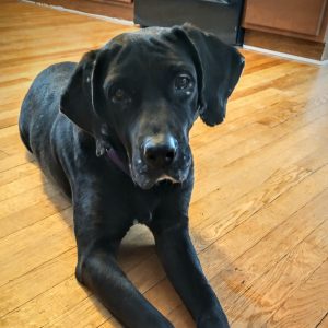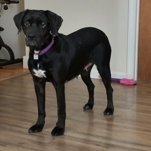 Juniper is a sweet, snuggly southern girl whose tail never stops wagging! She is black with adorable white spots and soft, floppy ears. She is happy and curious on walks, and is a pleasure to walk using an Easy Walk harness. She has started learning basic commands in her foster home and will be easy to train,as she is food motivated. Juniper is house and crate trained and gets along great with other dogs and the senior cat in her foster home. She is happy to meet people of all ages and greets by leaning and snuggling, not jumping on them. We think Juniper’s dream family enjoys cuddling as much as she does and will work with her on obedience so she will become the perfect pet!