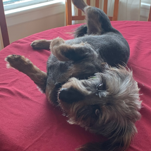 Age ain’t got nothing on Minka! At 10 years old Minka has her bursts of energy but she’s also thrilled to cuddle on the couch with her favorite people (which is everyone). She loves everyone, she is friendly and good with other dogs, although she does guard her food and treats a little bit. She is a jumper – she leaps onto your lap, onto the couch, the bed and the dining room table, if you’re not watching! She likes to go on walks and is eager to go for a car ride anytime.